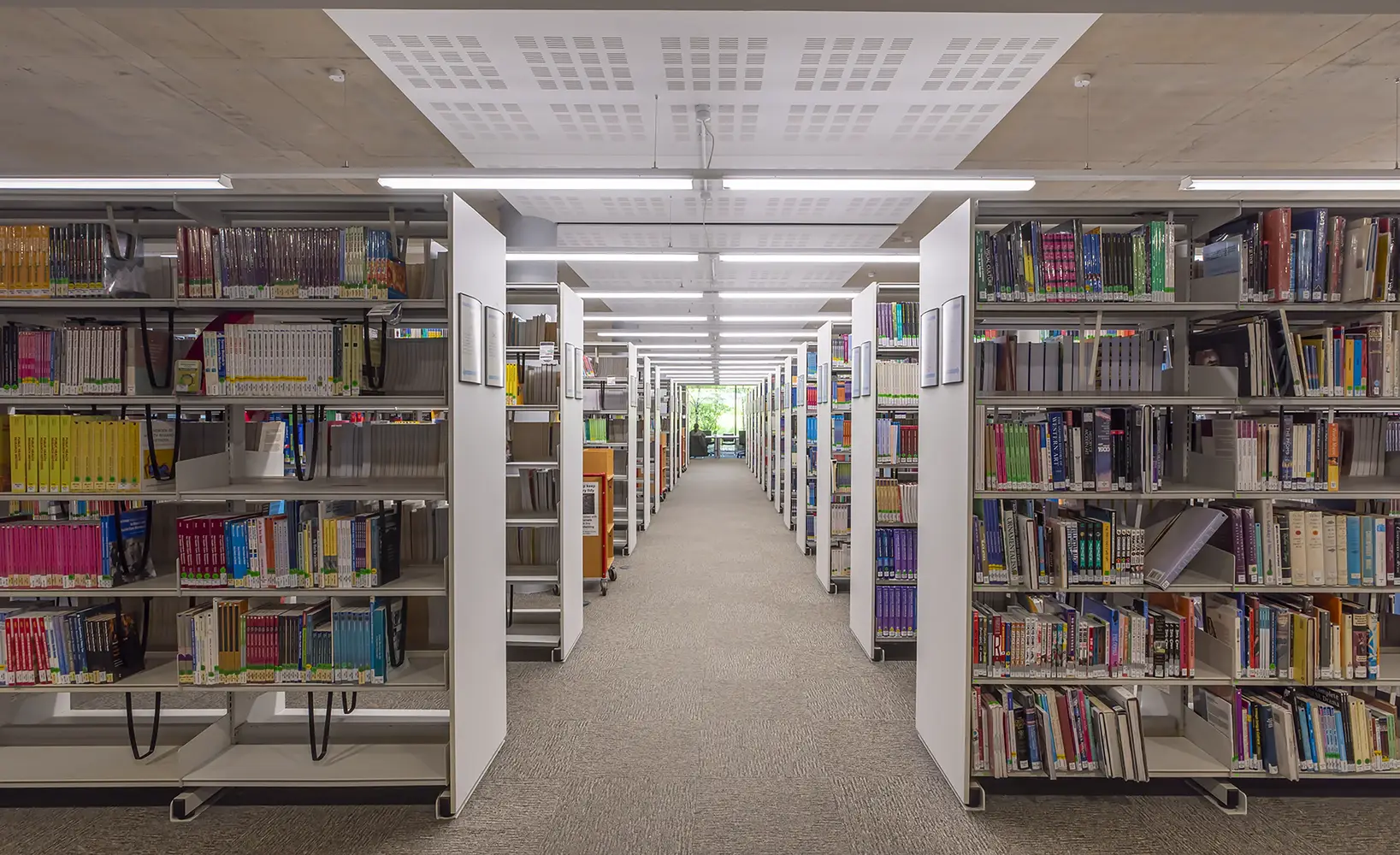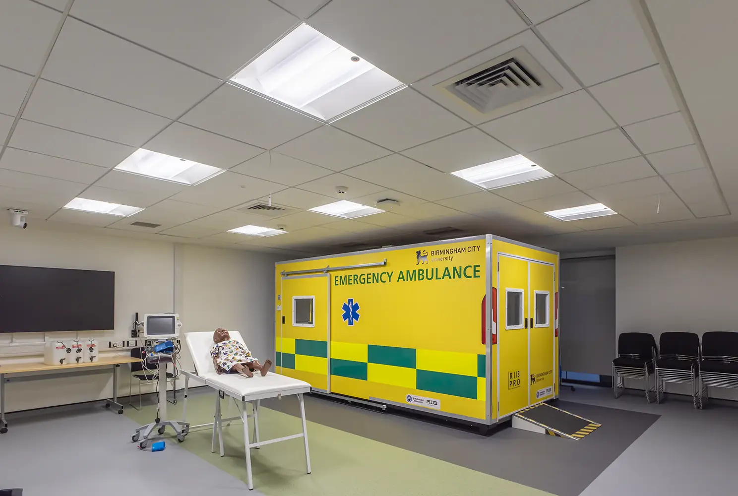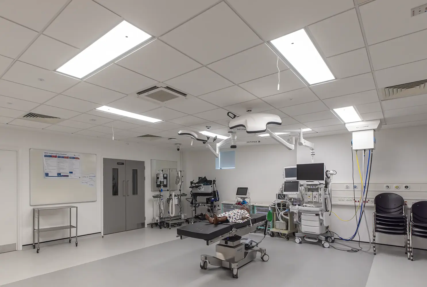 Wichtigste Neuerungen im übrigen Gebäudeteil ist die Installation eines flexiblen Schienensystem in der Bibliothek mit unserer Leuchte Kanby Zip. Damit wird in der Bibliothek um eine gute vertikale Ausleuchtung der Bücherregale gewährleistet, die unverzichtbar für das bequeme Auffinden von Büchern ist. In Vortragsräumen lenkt die lineare Leuchte Flexbar Diffuser den Blick auf die vorderen Präsentationsbereiche und in den simulierten Krankenzimmern sorgt die Leuchte Radiance mit hohem RA-Wert und kalter Lichtfarbe für Beleuchtung, wie man sie auch in einem echten Krankenhaus vorfinden würde.