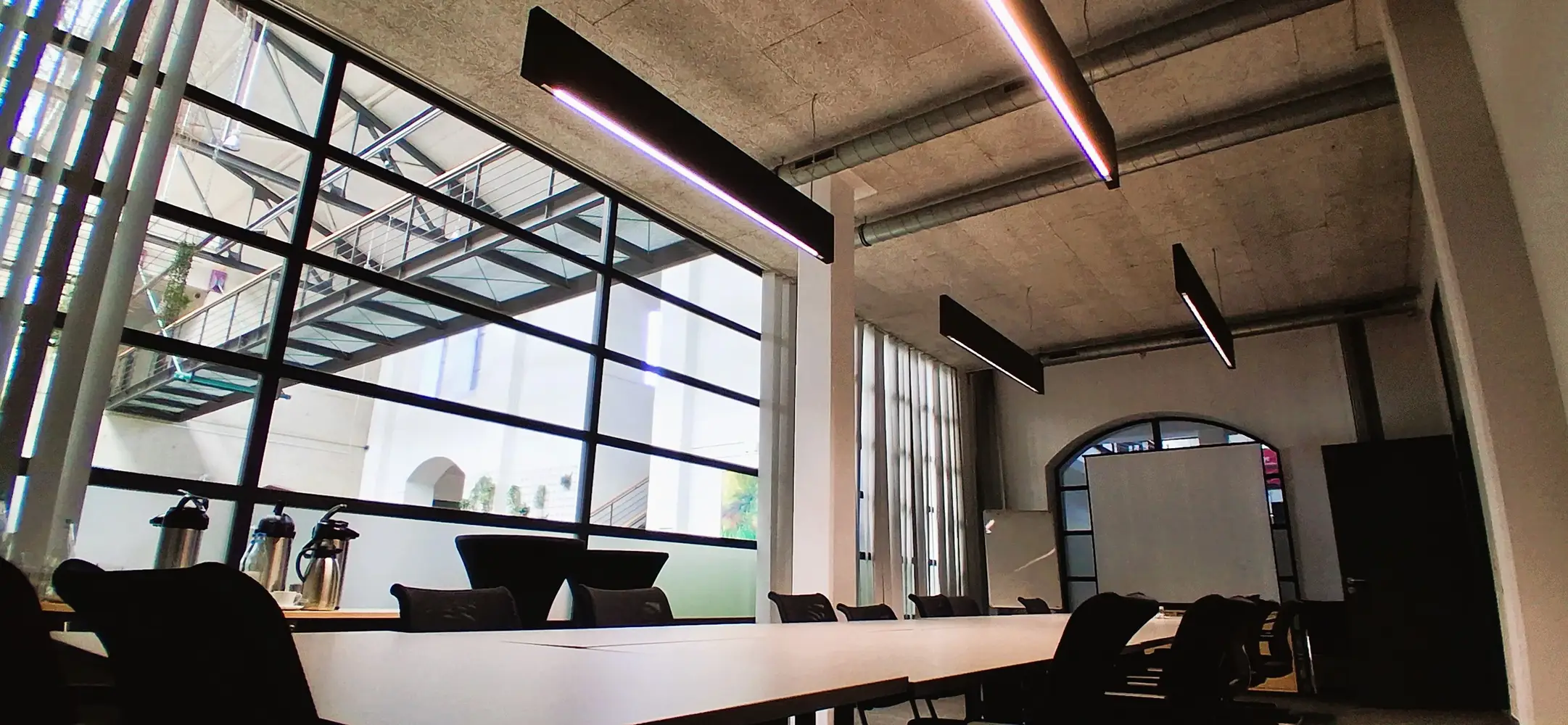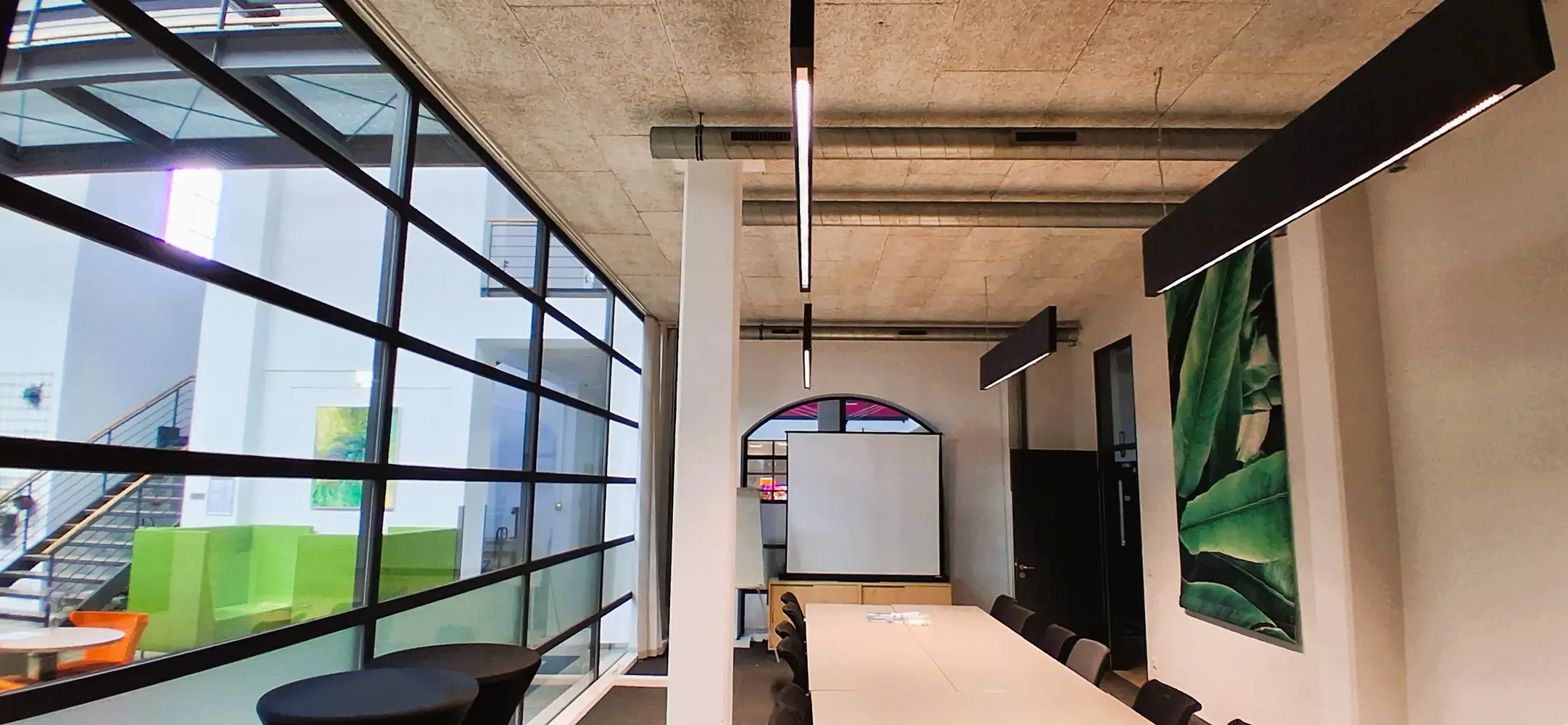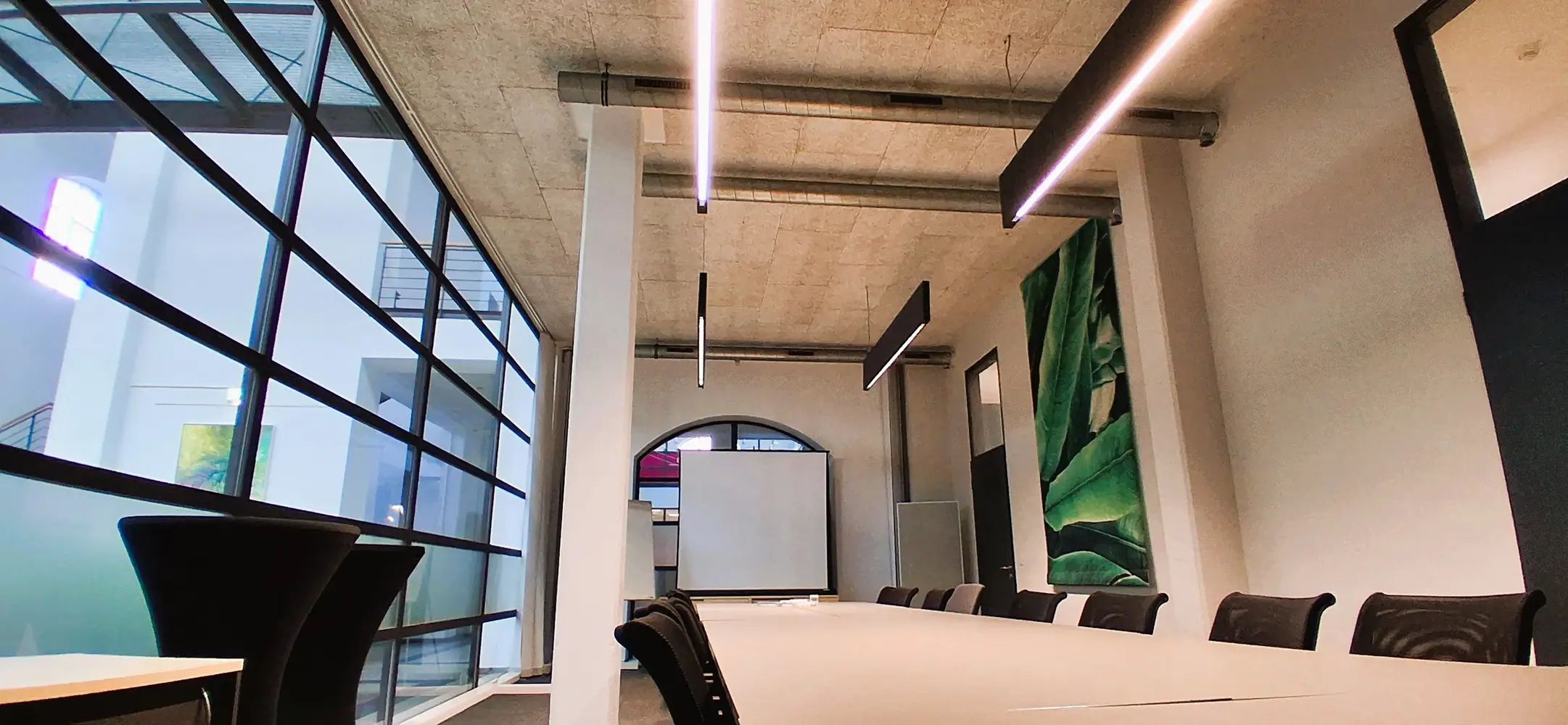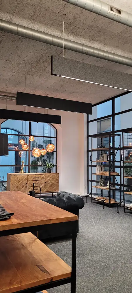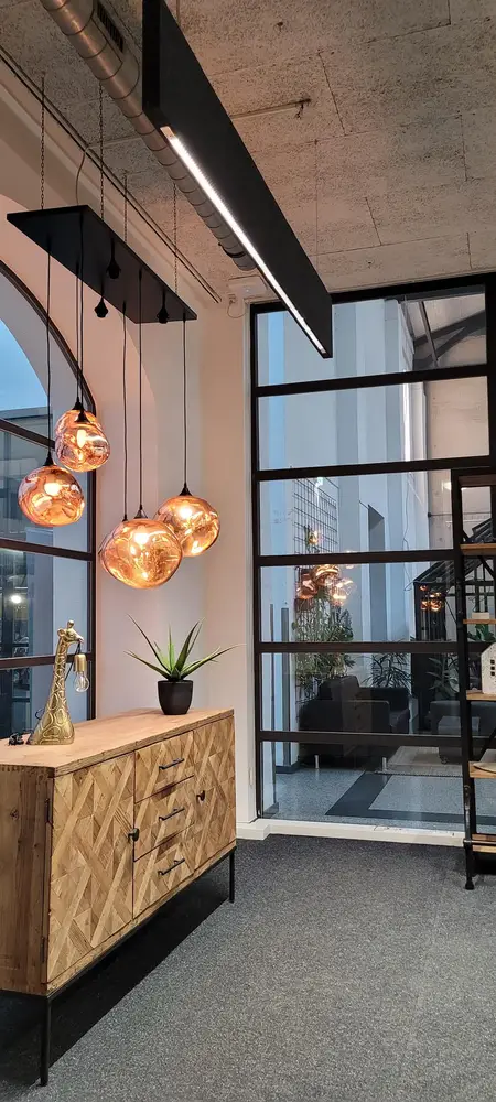 Nach einer genauen Bestandsaufnahme und einer – wie üblich für den Kunden kostenlosen – professionellen Lichtplanung durch unsere Lichtplanungsabteilung, konnten wir dem Kunden für die neue Beleuchtung verschiedene Vorschläge machen. Für die große Lichthalle bot sich im ersten Schritt des Projekts der Einbau der Pendelleuchte Flute an, ein Modell aus dem umfassenden Thorlux-Portfolio, das den alten Halogenleuchten im Aussehen recht nahekommt. Zwei Konferenzräume mit recht schmucklosen Leuchtstoffröhren wurden durch Installation der Thorlux-Hängeleuchte Flexbeam deutlich aufgewertet.