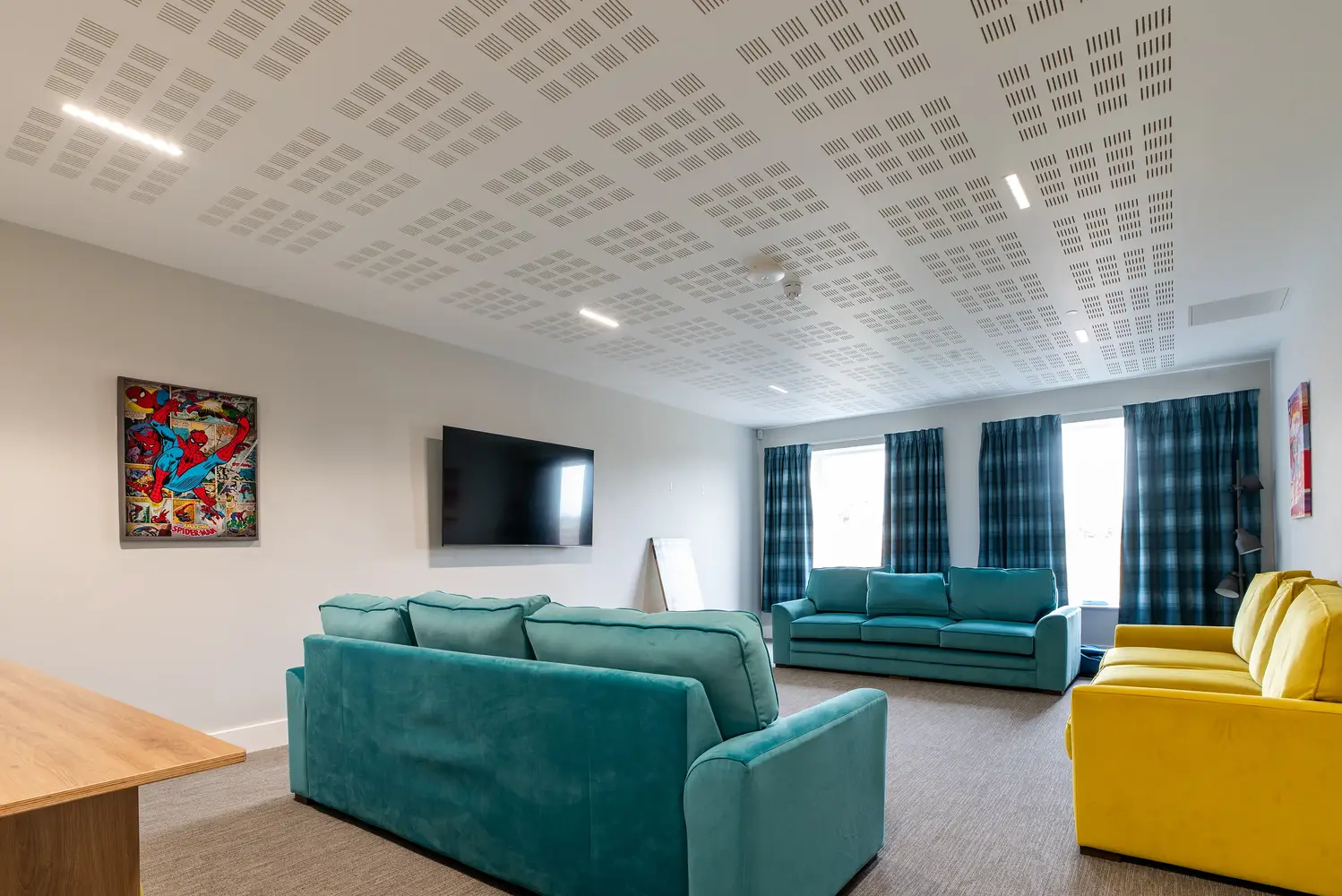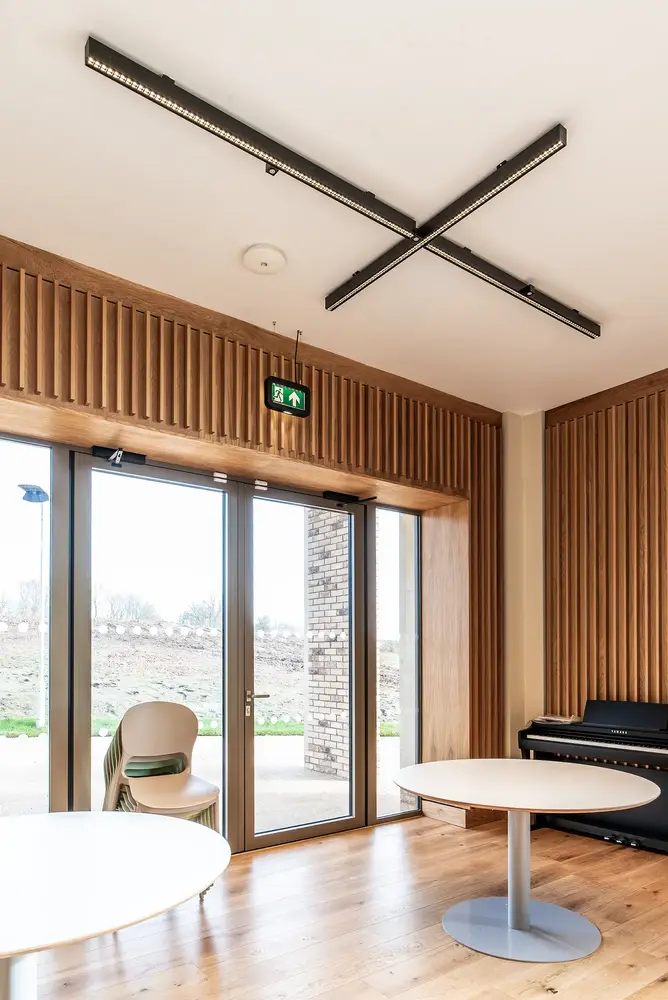 Die elegante Flexbar-Leuchte wurde entwickelt, um eine optimale und blendfreie Beleuchtung mit einer Effizienz von 160,5 lm/W zu bieten. Sie hat sich bei der Projektplanung als ideal für die Gemeinschaftsräume im Earle House erwiesen und trägt dazu bei, ein einladendes, komfortables Wohnumfeld für die Schüler zu schaffen.