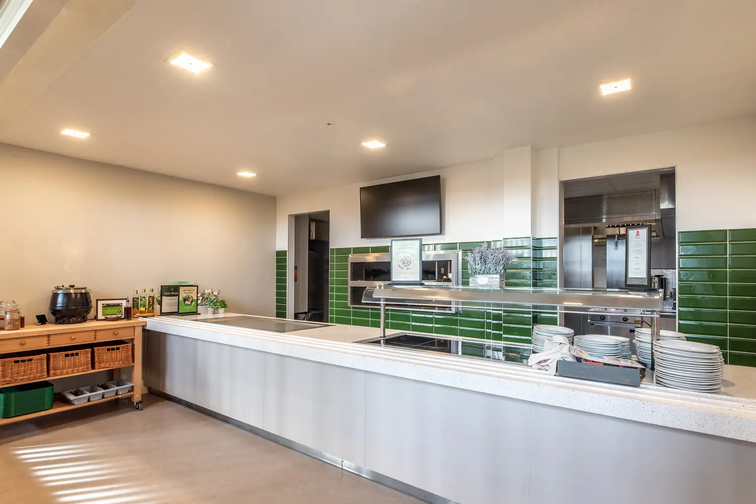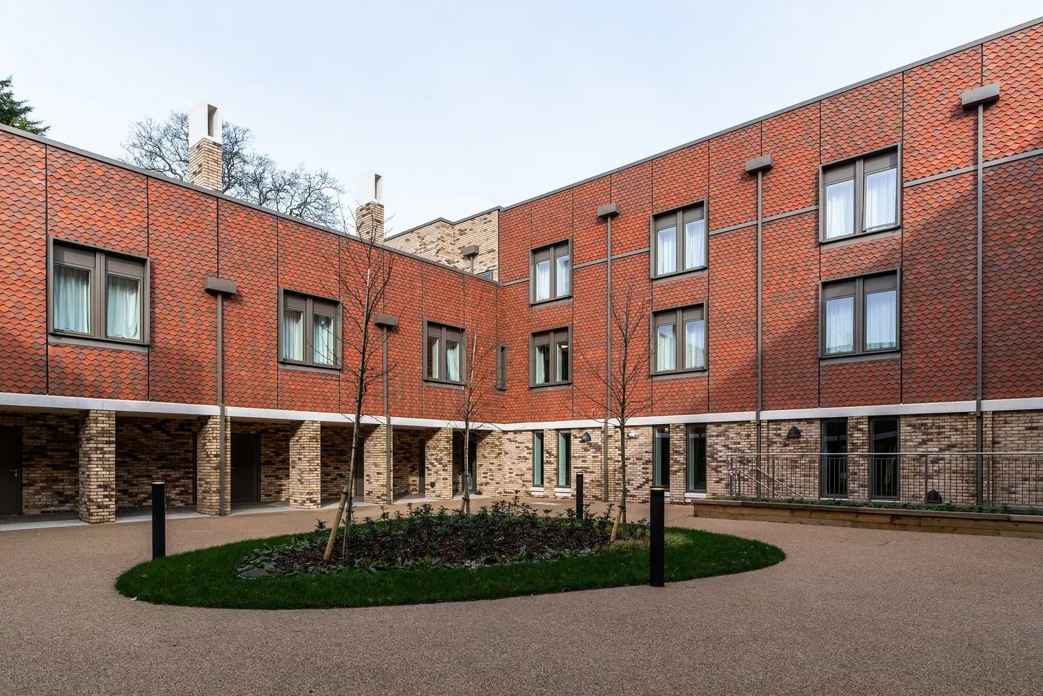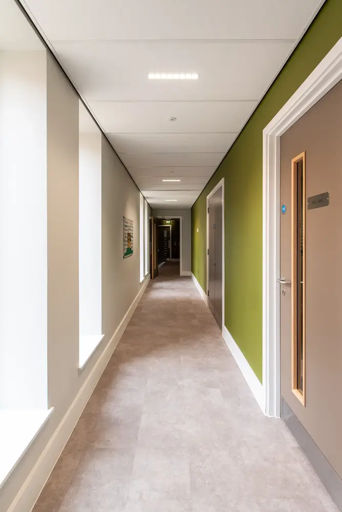 Für die Beleuchtung in den Schlafräumen sorgt die schlanke Halbeinbauleuchte Dot. Im gemeinschaftlichen Fernsehraum kommt die Einbauleuchte Flexblox zum Einsatz. Bei der Notbeleuchtung wurde durchgängig die Leuchte Firefly eingesetzt, kombiniert mit beleuchteten Lexi-Notausgangsschildern. Das stellt bei einem eventuellen Stromausfall eine absolut zuverlässige Fluchtwegbeleuchtung sicher. Außen an der Gebäudefassade ist die wandmontierte Leuchte Realta installiert, die Wege auf dem Gelände werden von der Pollerleuchte Passway und von der Mastleuchte Starbeam Eco erhellt.